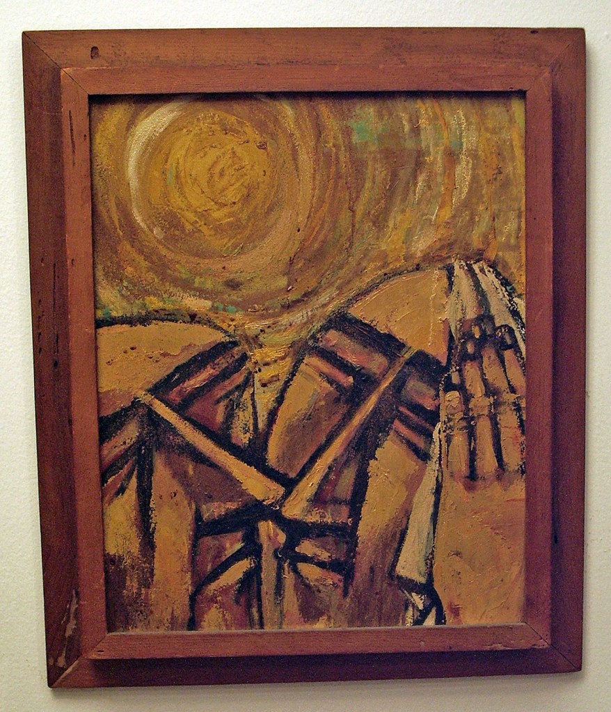 This unsigned oil painting intrigued me with its earth tones, primitive/modern theme, and the multi-level frame really adds to its flavor. The owner of the antique shop where I purchased this painting claimed it is a portrait, or caricature, of the two artists – Pablo Picasso and Vincent Van Gogh. He did not know the artist, only the painting’s previous owner. The artist, whoever he or she is/was, seems to lean towards the style of Picasso. And as I trust the dealer’s assessment, I would say “Picasso & Van Gogh” is a fair title for this work.