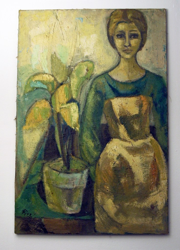 This lady has that enigmatic look we often associate with the Mona Lisa. The artist’s signature is equally enigmatic: Riva. Essentially, I like the colors, texture, and that mysterious look on the lady’s face.