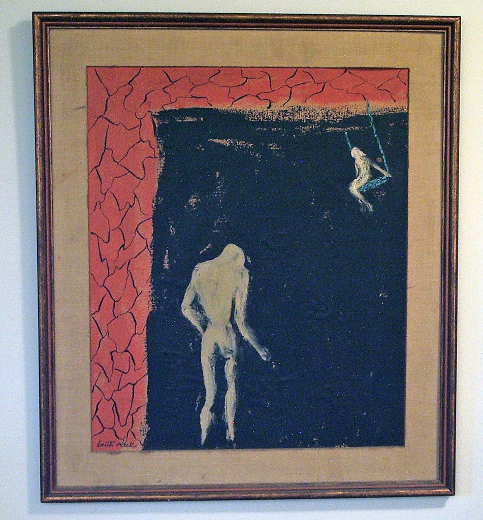 That’s not the official title of this mixed-media work; that’s my description. Signed by the artist, Edith Aleck, there is no title and the dealer knew nothing other than it came from an estate in Hampton Bay, NY. I find the simple, implied artistic statement intriguing and the use of paint, pastel, and a layered canvas quite creative.